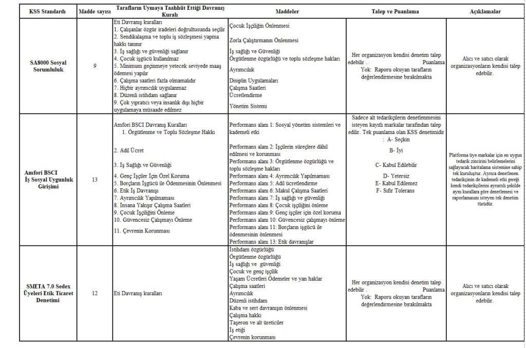 Bu KSS standartlarının ve denetimlerinin en önemlileri Amfori BSCI ve Sedex olup her birinin ayrı birer platformu vardır. Ülkemizde ihracat yapan bir çok firmanın yurt dışı müşterisi tarafından ihracat şartları arasında yer almakla beraber, bu sisteme dahil olan ihracatçı firmaların da çalıştığı tüm tedarikçilerin ya bu ilkelere uygun hareket etmesi ya da kendilerinin da bu sisteme dahil olması gerekmektedir.