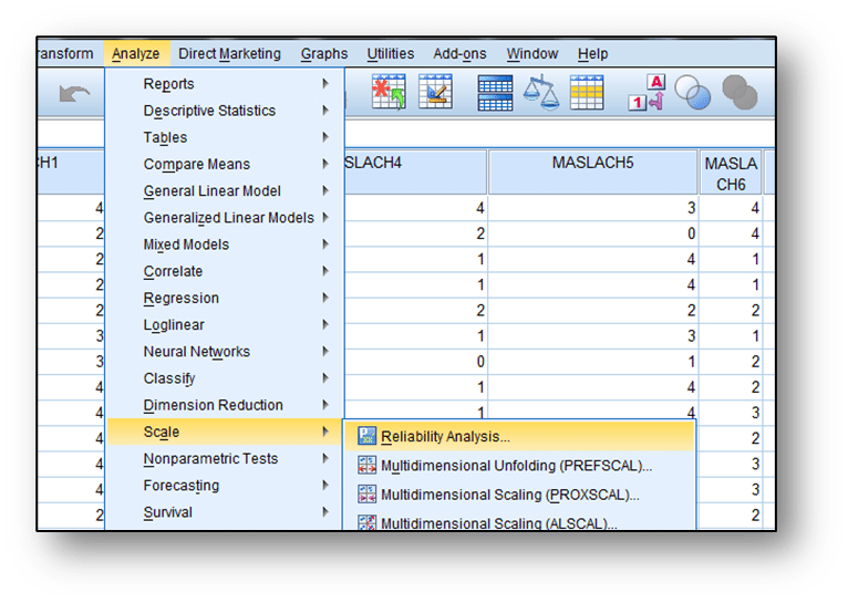 Örnek: Hemşirelerin tükenmişlik düzeyleri ile ilgili bir araştırmada kullanılan bir ölçeğin güvenirliliğin ölçülmesi amacı ile IBM SPSS’ te izlenecek yol aşağıdaki şekildedir: