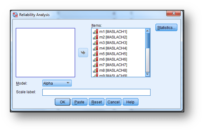 Sekmeleri tıklanır, açılan ekranda “Items” bölümüne güvenilirliği incelenecek olan değişkenler aktarılır ve “OK” butonuna tıklanarak Cronbach α değeri elde edilir.