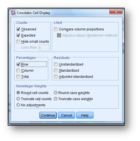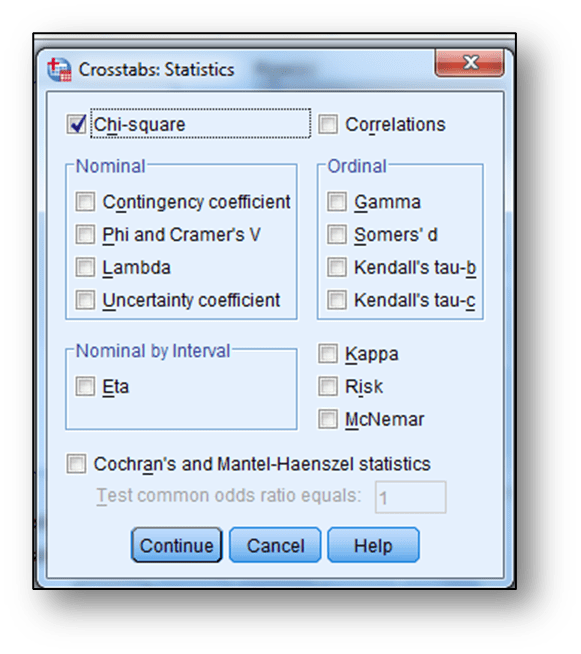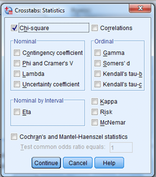 Çapraz tablo oluşturma işleminden farklı olarak “Statistics” sekmesinden “Chi-square” istatistiği işaretlenir ve “Continue” tıklanır.