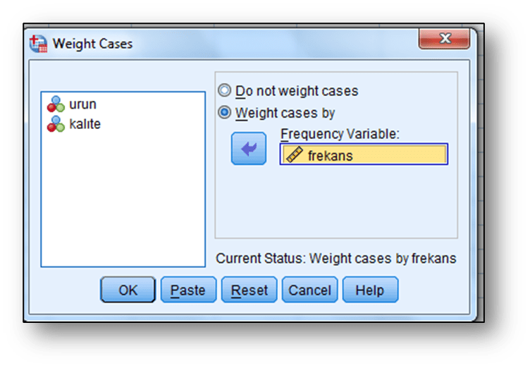 Sekmelerine tıklanması ile açılan ekrana “Weight case by” seçeneği işaretlenir ve bu seçeneğin altında yer alan ekrana frekans olarak tanımlanan frekans değişkeni aktarılır ve “OK “ tıklanır.
