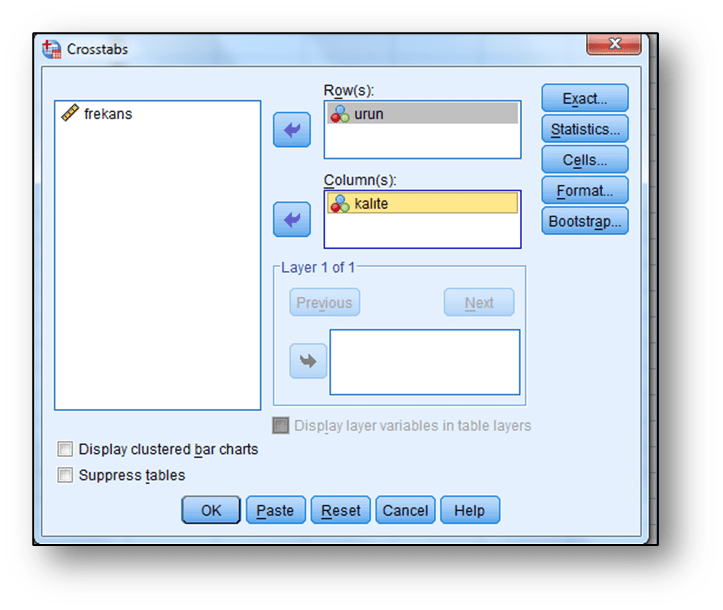 Seçeneği tıklandığında aşağıdaki ekran elde edilmektedir. Bu ekranda daha önce çapraz tablo oluşturmada bahsettiğimiz gibi değişkenlerin aktarılmasından sonra “Statistics” sekmesi tıklanır. Açılan ekrana “Chi-square” seçeneği işaretlenir ve “Continue” tıklanır: