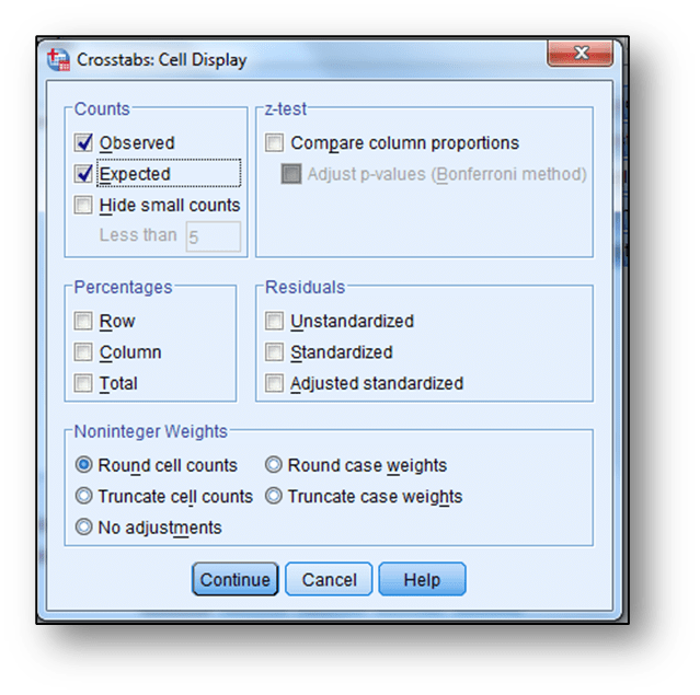 Sonra “Cells” sekmesi tıklanır, açılan ekranda gözlenen ve beklenen frekanslar için “Observed” ve “Expected” seçenekleri işaretlenir, önce “Continue” ve daha sonra “OK” tıklanarak analiz sonuçlandırılır: