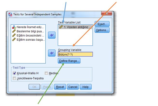 Örnek: 3 farklı bölümde okuyan öğrencilerin Vize sonuçları arasında farklılık olup olmadığının test edilmesi için gerekli adımlar aşağıdaki gibidir (Parametrik varsayımların sağlanamamaktadır):
