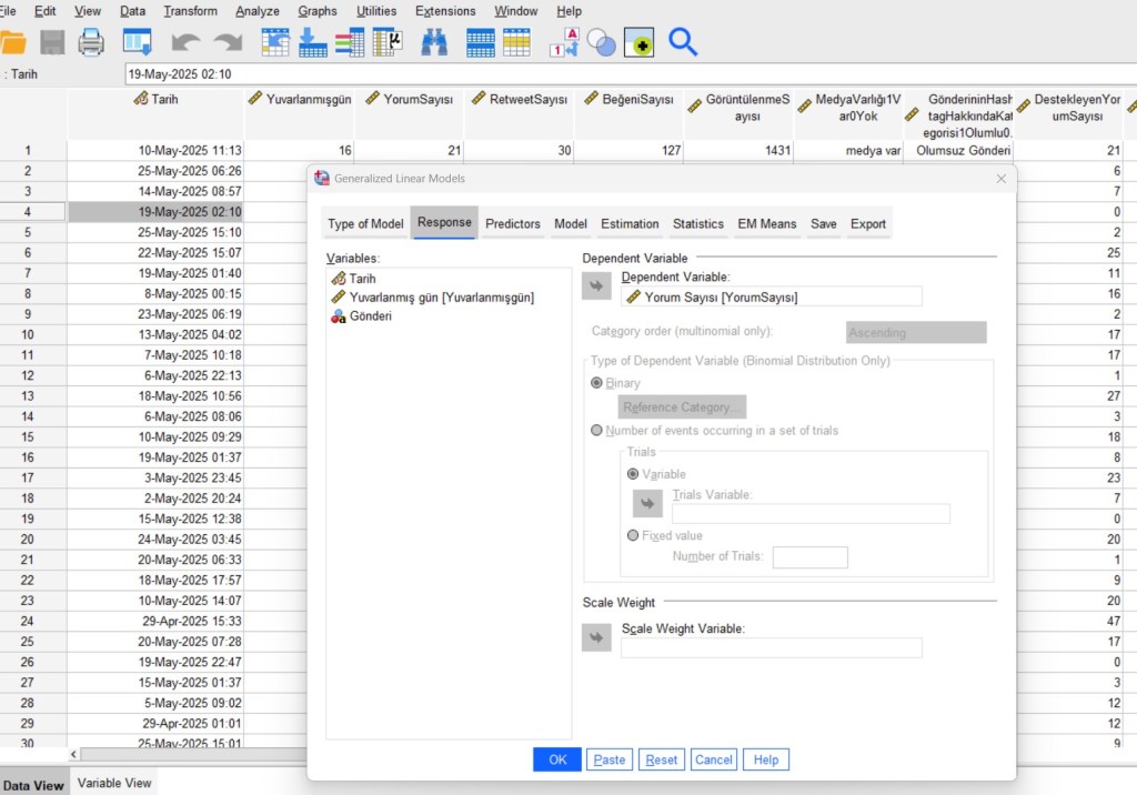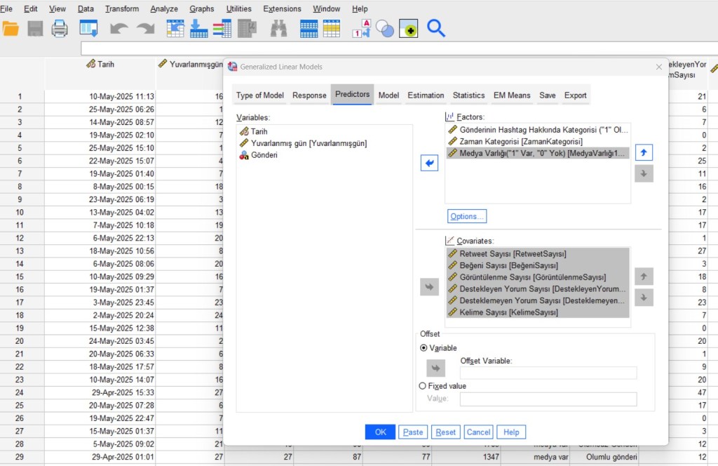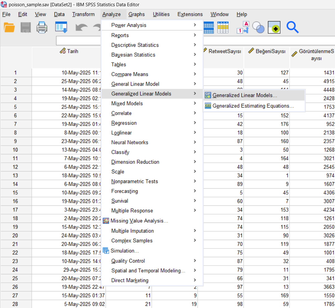 SPSS’te: Analyze → Generalized Linear Models → Generalized Linear Models… yolu izlenir. Açılan pencerede “Type of Model” sekmesinden Poisson loglinear’ı seçilir . “Link Function” otomatik olarak Log seçili gelecektir ( değiştirilmemelidir).