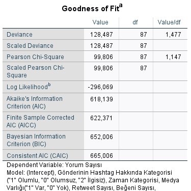 “Statistics” sekmesinden “Pearson Chi-square” ve “Deviance” değerlerine bakın. Değerler serbestlik derecesine (df) yakınsa model uyumu iyidir. Değerler çok büyükse aşırı yayılım var demektir.