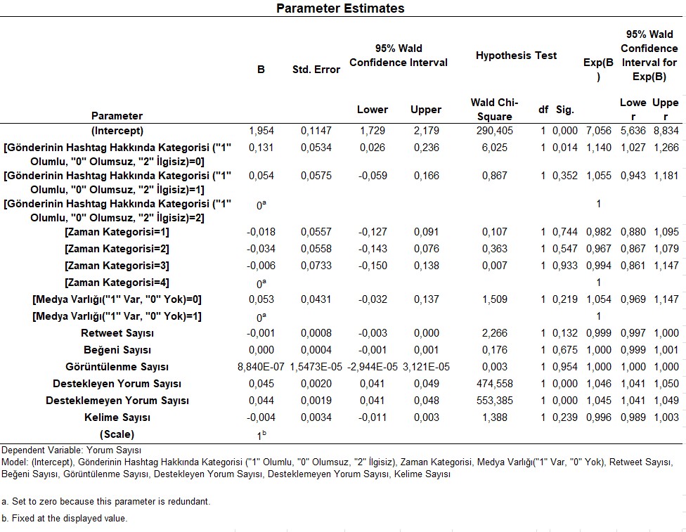 Yorum Örneği: Destekleyen Yorum Sayısı (Exp(B)=1.046): Destekleyen yorum sayısındaki 1 birim artış, genel yorum sayısını %4,6 artırır (IRR > 1 olduğu için).