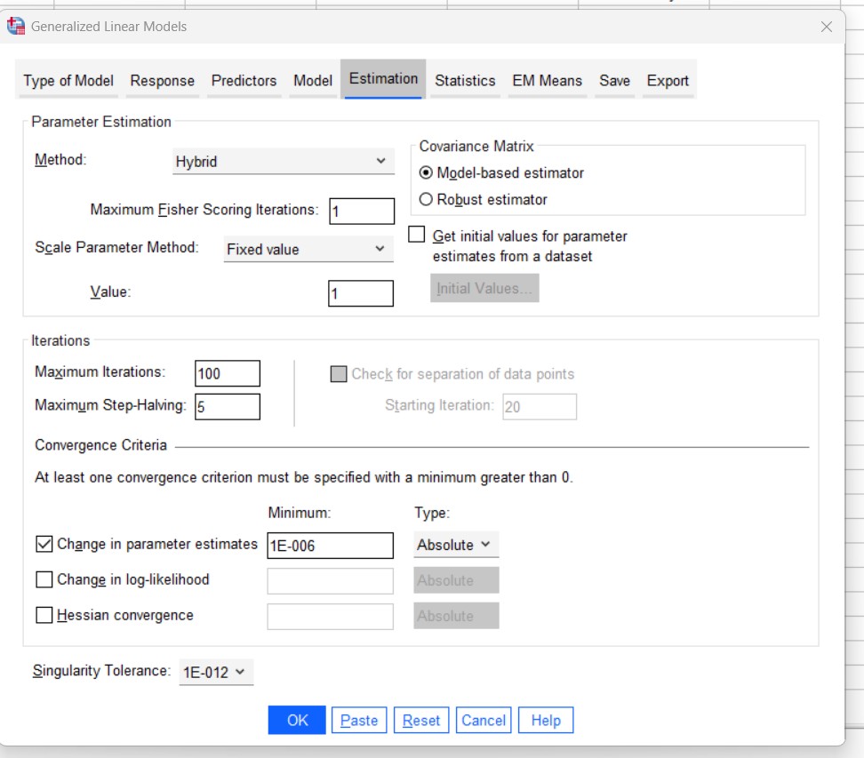 - Estimation sekmesinde varsayılan ayarlar (Deviance veya Pearson) kabul edilir.
