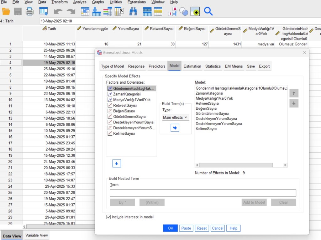 - Model sekmesinde “Main Effects” kuralını seçip, bağımsız değişkenler modele eklenir.