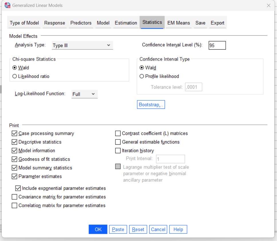 Eğer aşırı yayılım varsa: “Type of Model” sekmesinde “Negative binomial with log link” seçin. Aynı adımları tekrarlayın.