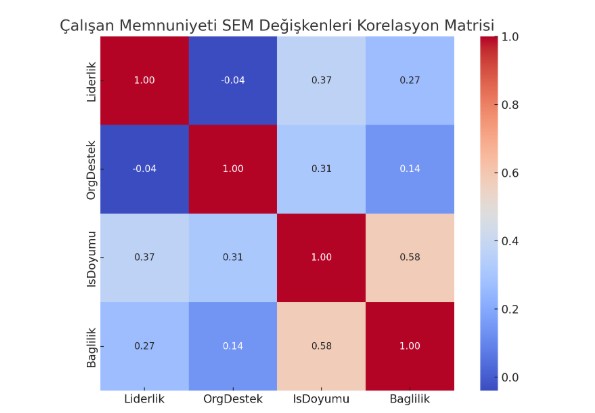 Liderlik, Örgütsel Destek, İş Doyumu ve Bağlılık arasında güçlü pozitif ilişkiler gözlenmiştir. - Liderlik & Örgütsel Destek → İş Doyumu: