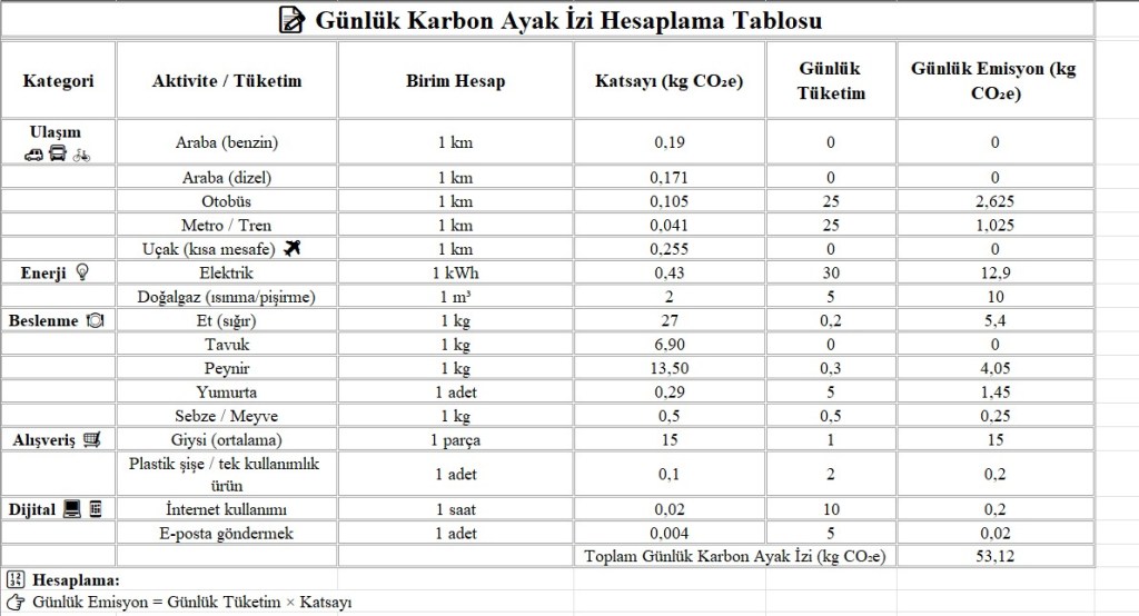 İnternette yaptığımız her işlem enerji harcar. Gereksiz e-postaları silmek, bulut depolamada düzenleme yapmak ve enerji tasarruflu cihazlar kullanmak da etkilidir. - Aşağıda Günlük Karbon Ayak İzi hesaplama Tablosu örnek olarak hem resim hem indirilebilir excel formatında yer almaktadır. CO2 değerleri FAO LCA(Food and Agriculture Organization Life Cycle Assessment Yani Birleşmiş Milletler Gıda ve Tarım Örgütü Yaşam Döngüsü Değerlendirmesi) , Avrupa ortalaması ve IPCC 2021 (Intergovernmental Panel on Climate Change, 2021) kaynaklarından alınmıştır.